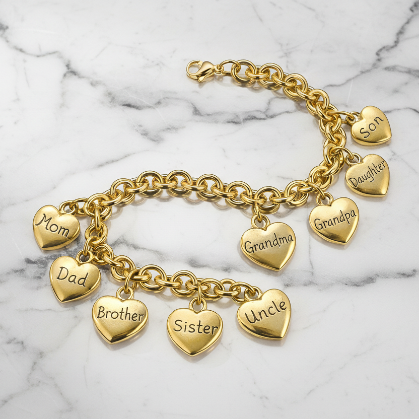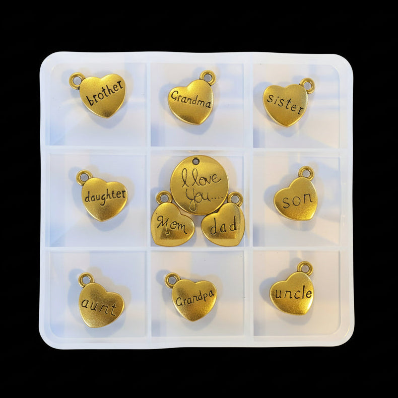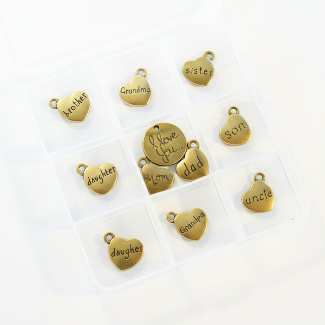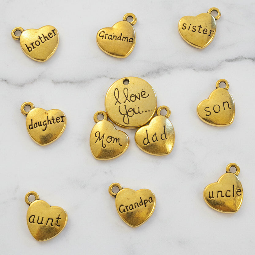 Celebrate your love of family with this 11-piece gold charm collection, featuring heart charms engraved with beloved family members—from Mom and Dad to Brother, Sister, Aunt, Uncle, Grandma, and Grandpa and more. Perfect for pairing with one of our charm bracelet bases found here.