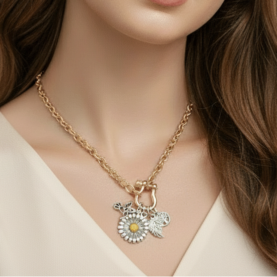 Two Tone Sunflower, Hummingbird Nature Carabiner Necklace, Gold - 20 inch