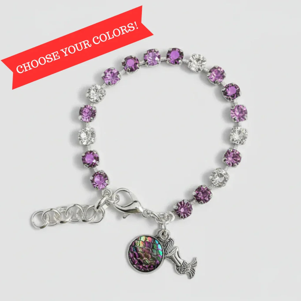 This sparkly Mermaid bracelet is hand set with Genuine Swarovski® and/or Preciosa® crystals pictured in a beautiful family of blue or pink colors. A Mermaid backed with a sparkly Scale charm dangles as the focal point of this handcrafted piece. See Picture for Crystal size examples.