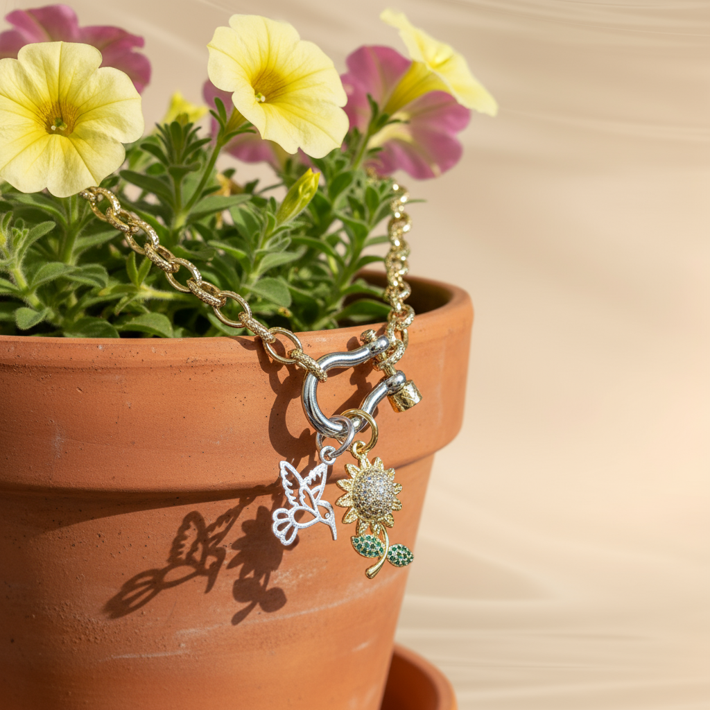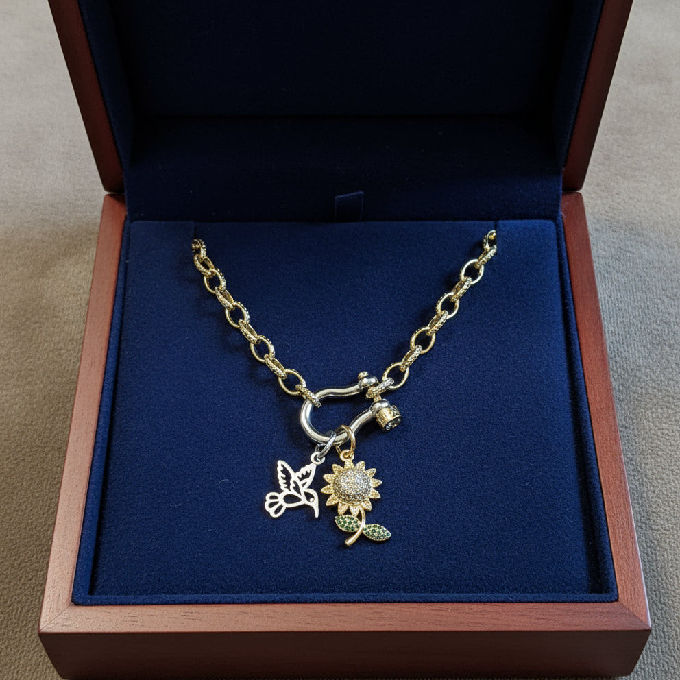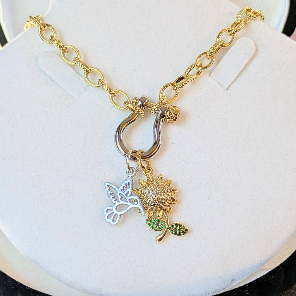 Gold CZ Daisy and Silver Hummingbird Carabiner Necklace, Gold - 20 inch