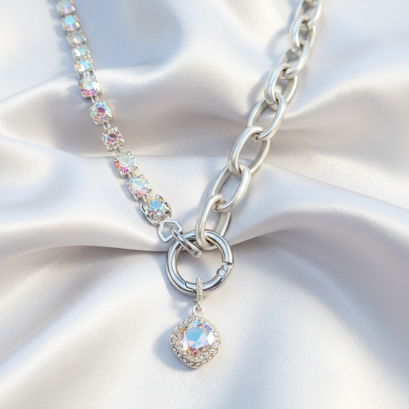 Crystal & Silver Snap Ring Necklace, Matte Silver - 22 inch