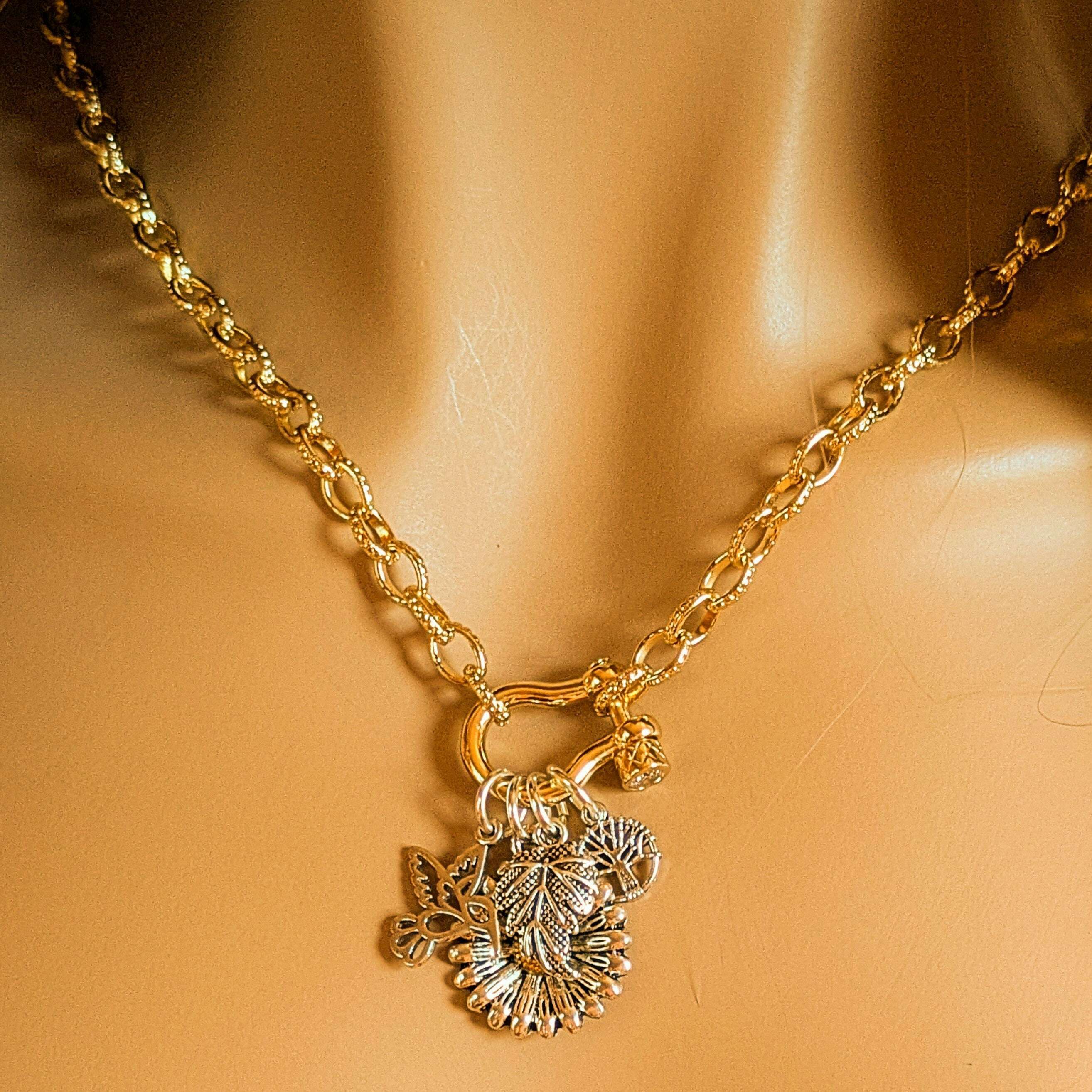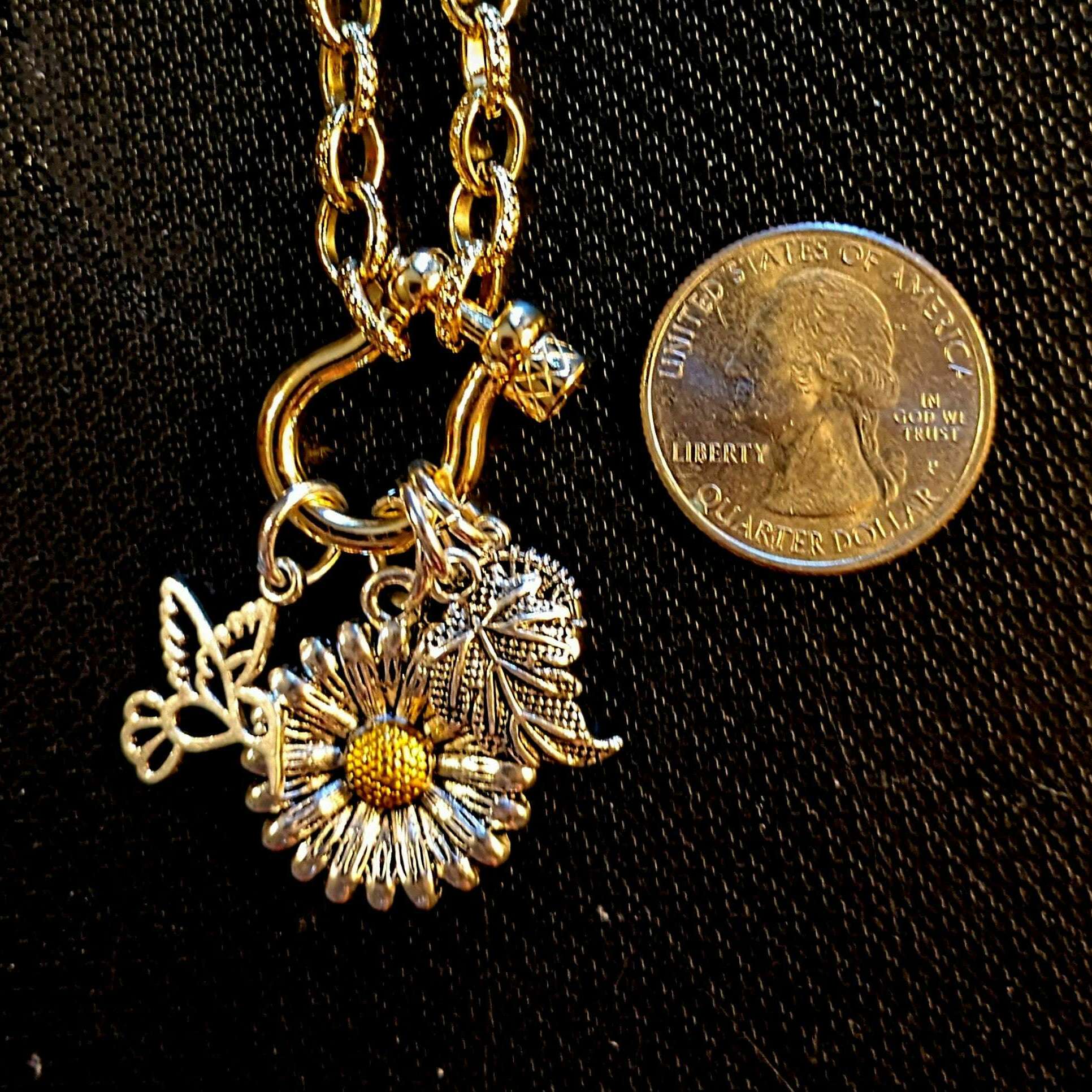 Two Tone Sunflower, Hummingbird Nature Carabiner Necklace, Gold - 20 inch