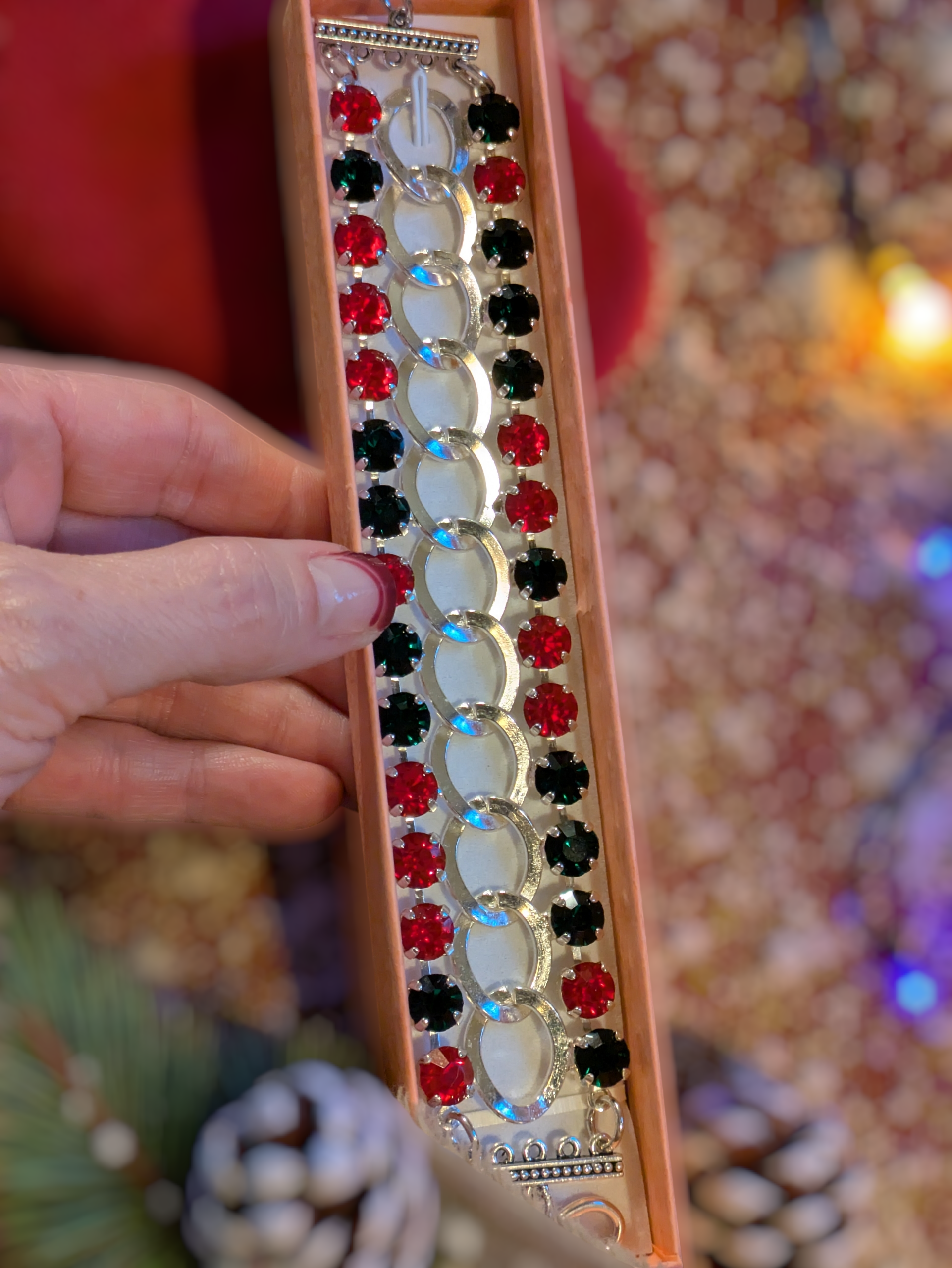 Red and Deep Green Multi Faceted Crystal Bracelet-Large 8 inch