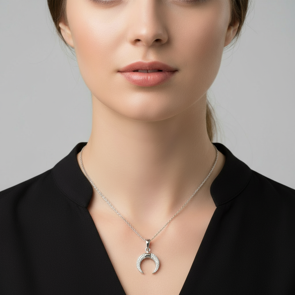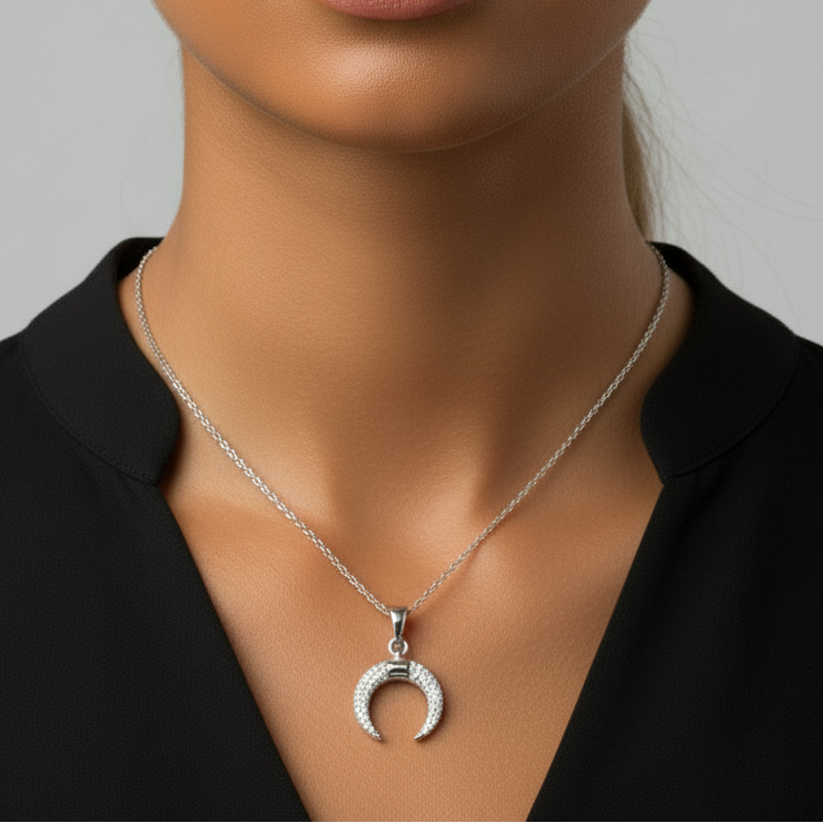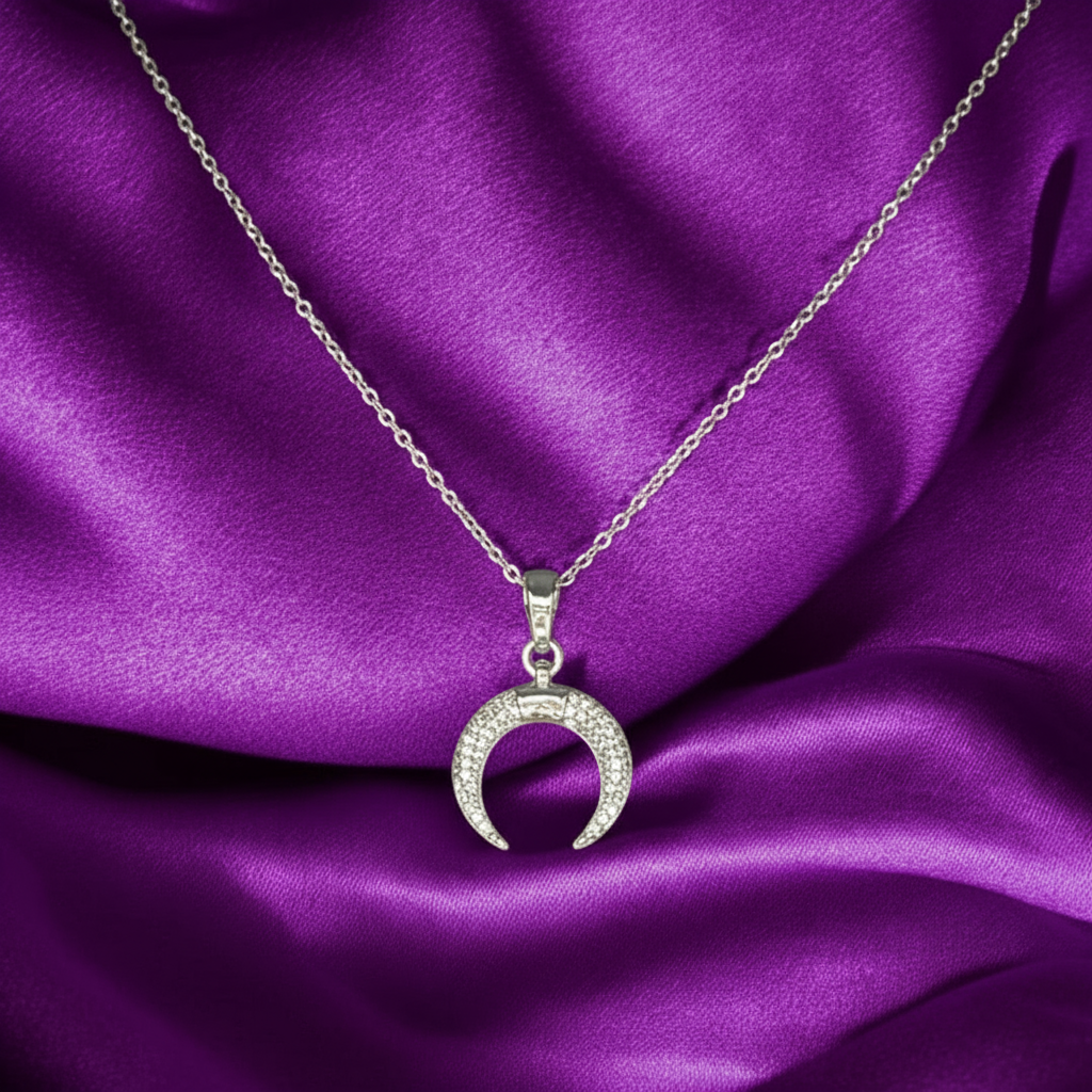 Downward Crescent Moon Necklace, Crescent Horn Necklace, Silver