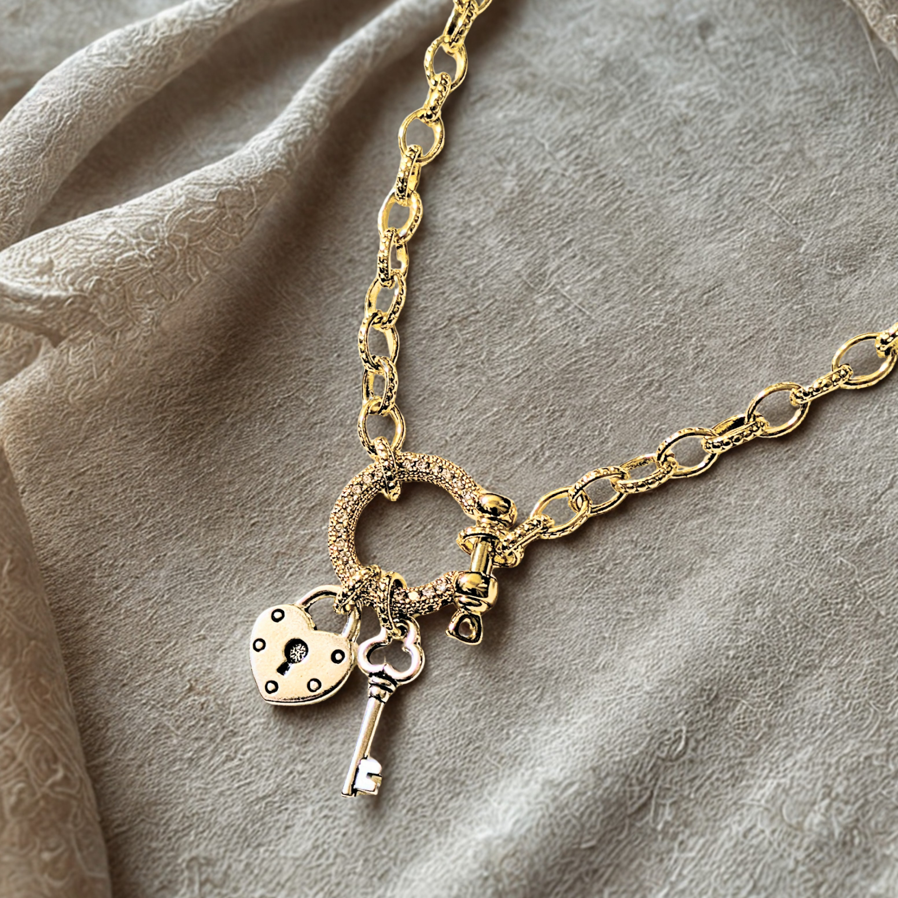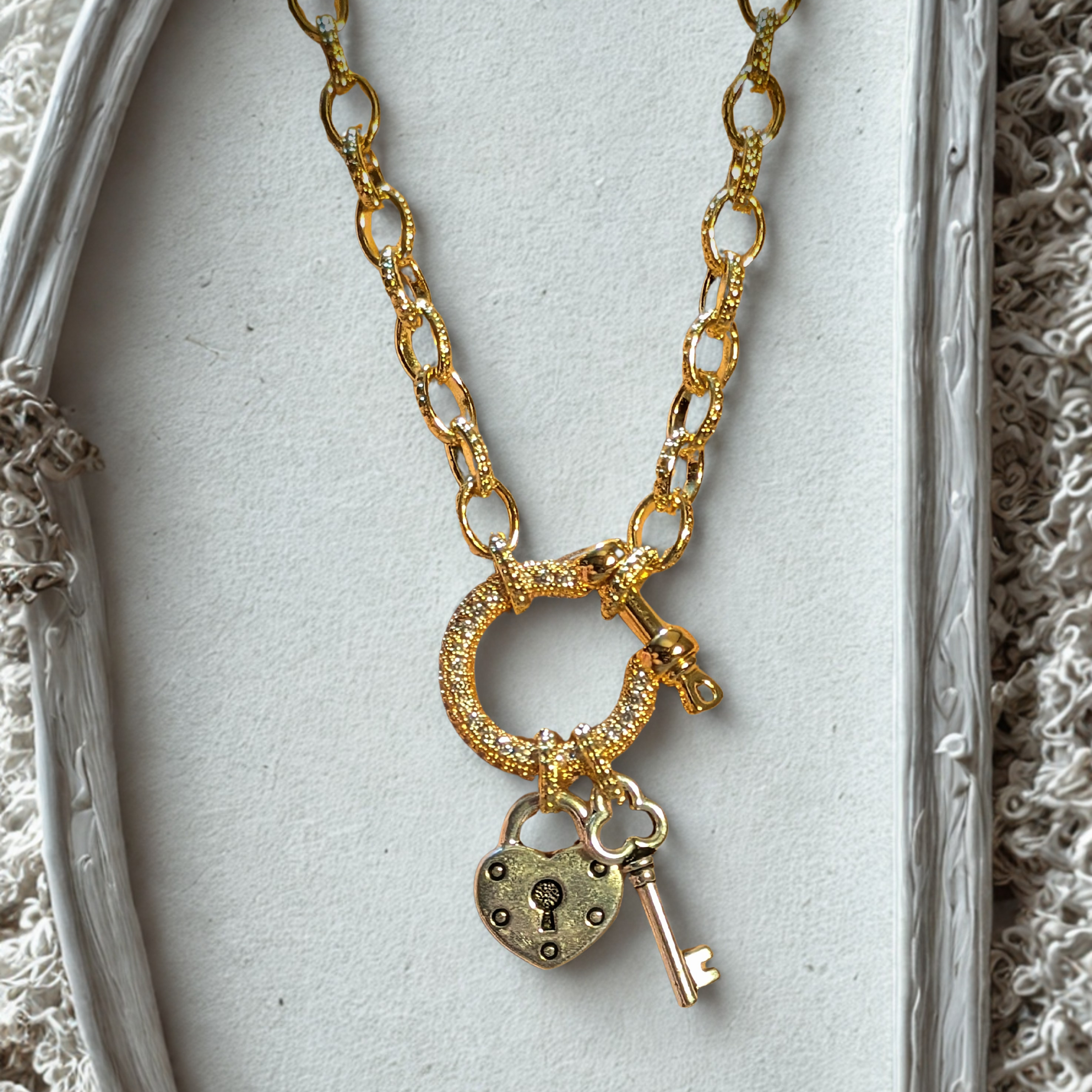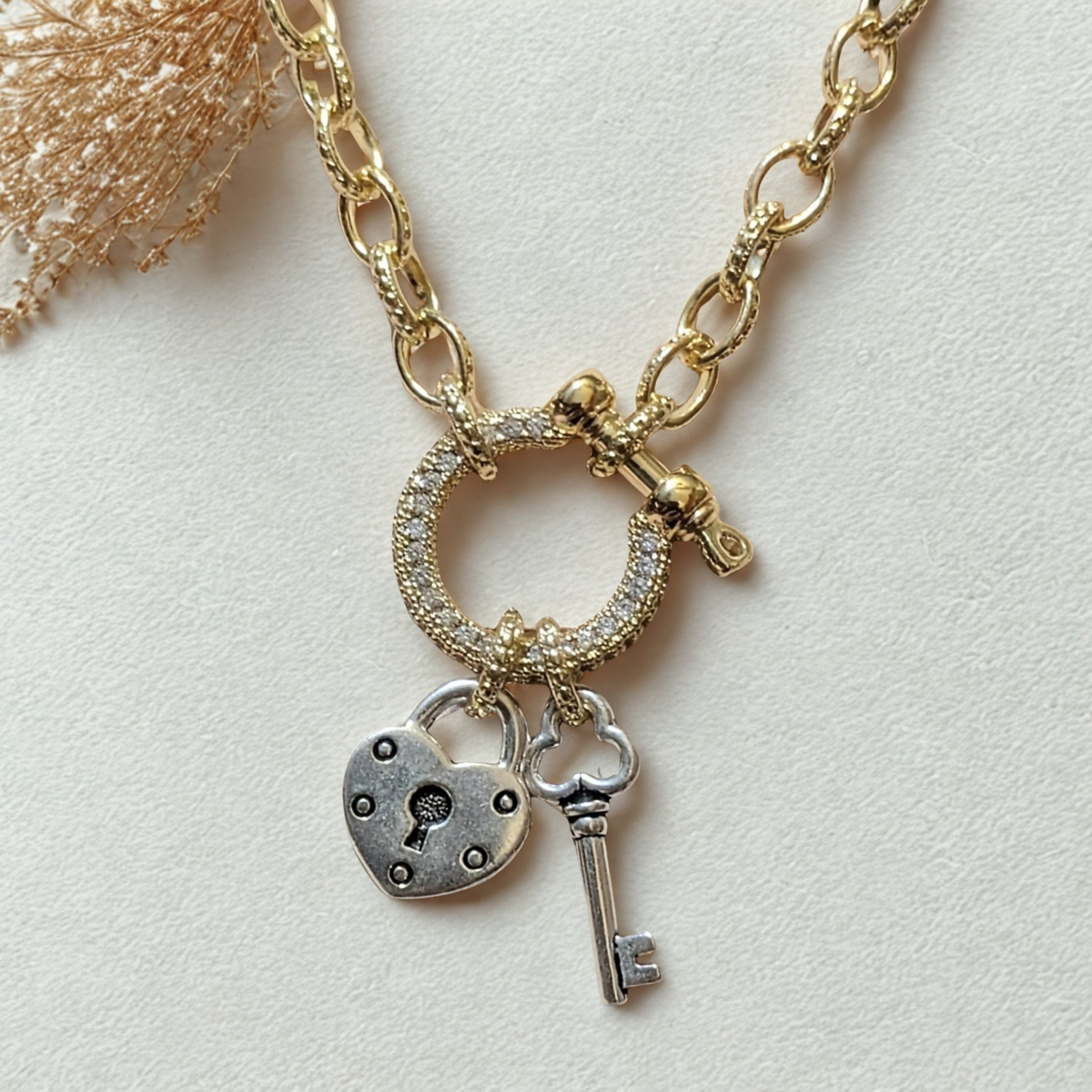 Materials: 24k Gold filled 6mm link chain, Cubic Zirconia Shackle, Silver Tierra Cast pendants