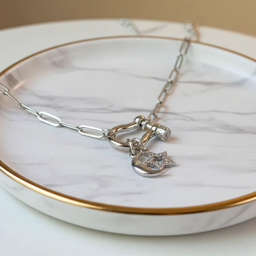 Celestial Moon CZ Star Shackle Clasp Carabiner Necklace, Silver - 20 inch
