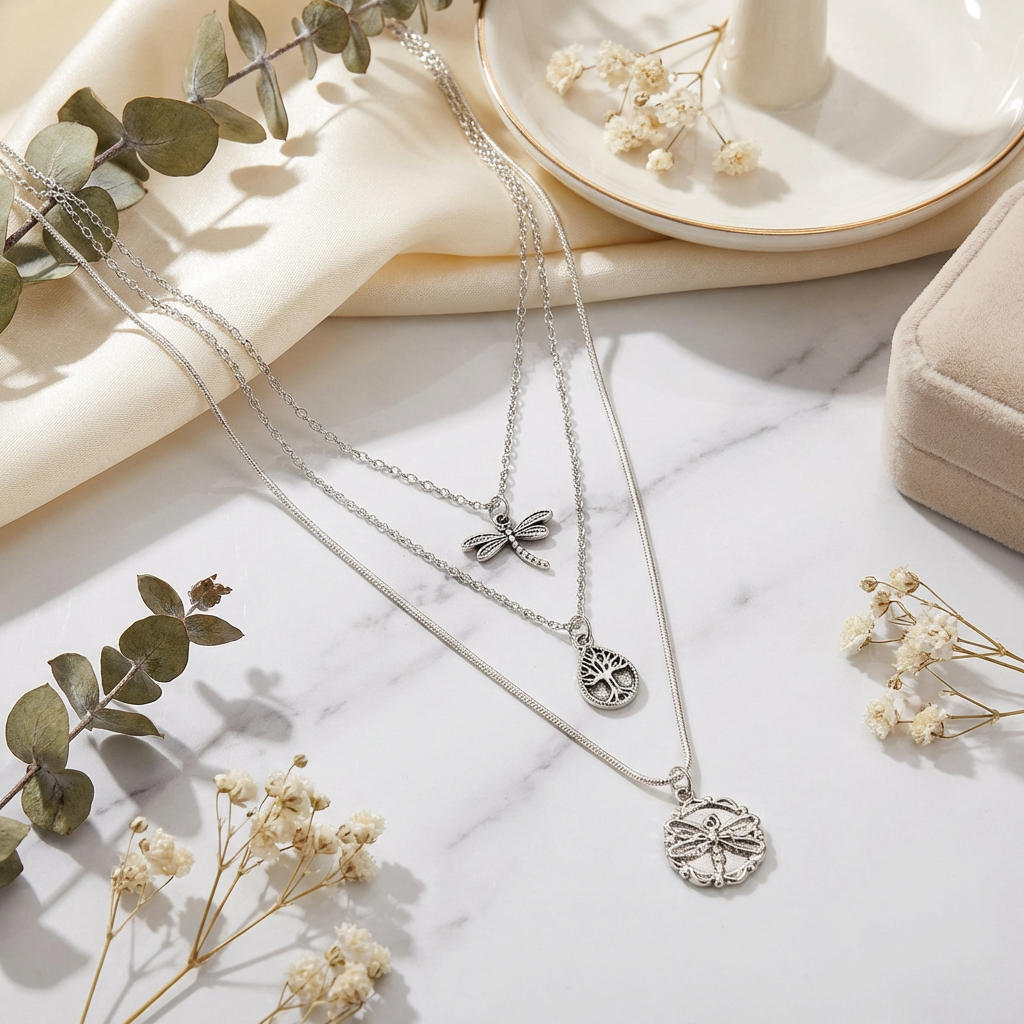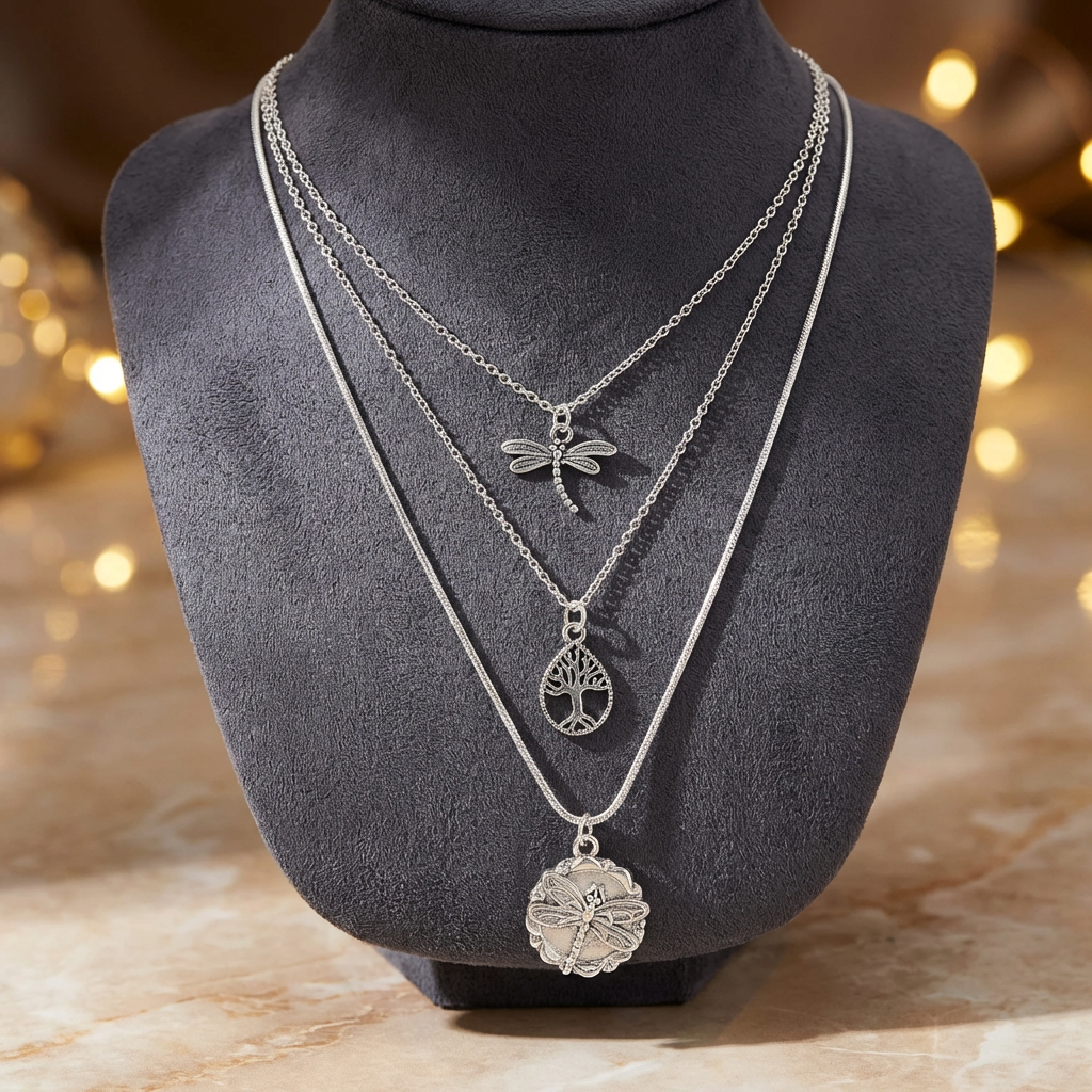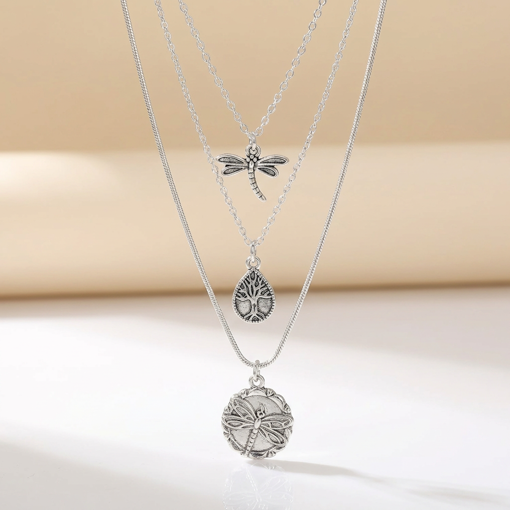 Any dragonfly enthusiast will love this beautiful necklace set. A tiny dragonfly pendant hangs from the shortest sterling silver chain, followed by a teardrop Tree of Life pendant on a delicate sterling silver rope chain. The longest necklace is a smooth sterling silver snake chain adorned with a dragonfly circle pendant. A thoughtful gift for someone special or a lovely treat for yourself.