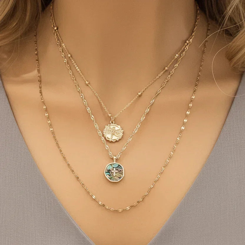 Abalone Cross Bar/Dragonfly Layered Necklace Set, Gold
