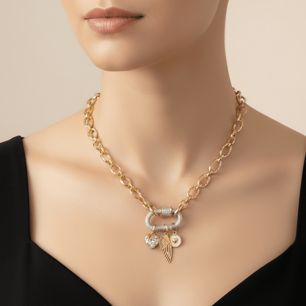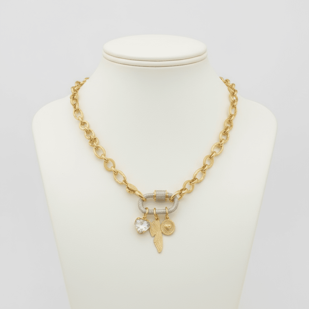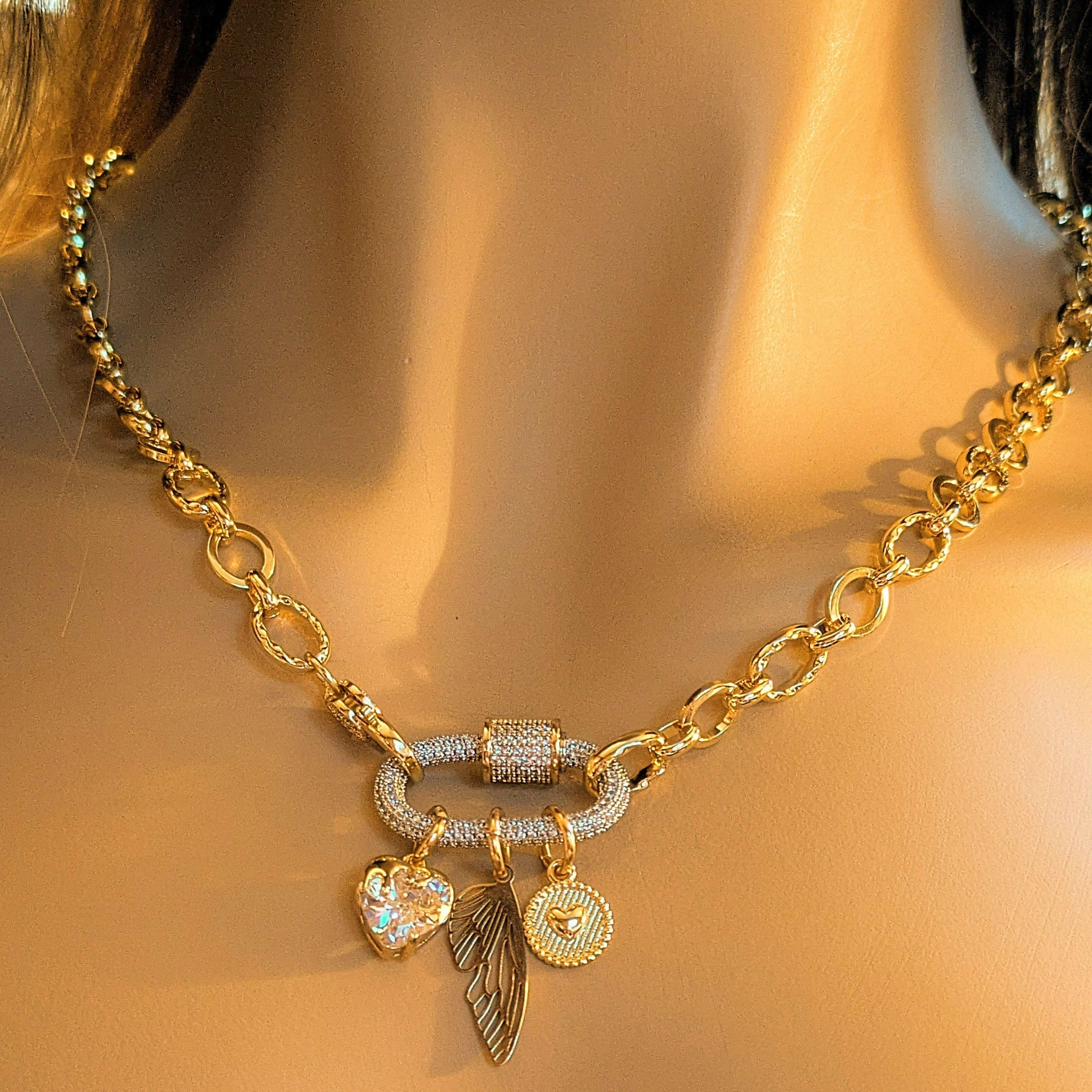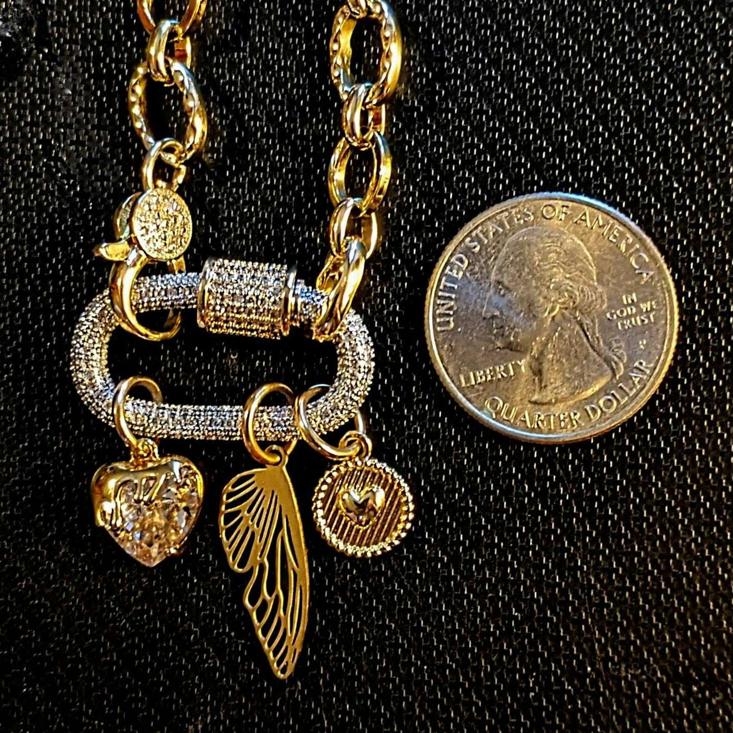 Dragonfly/Fairy Wing, Heart Carabiner Necklace, Gold - 20 inch