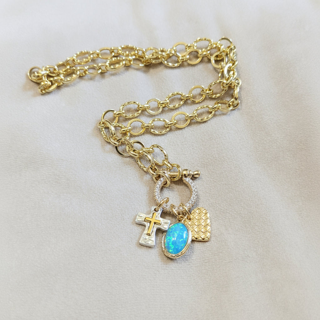 Collection of Gold filled and Gold plated necklaces made of Sterling Silver or Stainless Steel with genuine 14k or 18k Rose-Gold plating. Making for a gorgeous finish with the hypoallergenic strength of steel! Featuring multi charm designs.