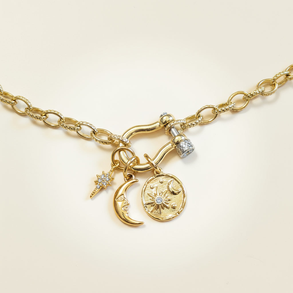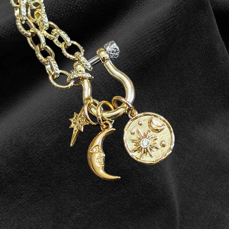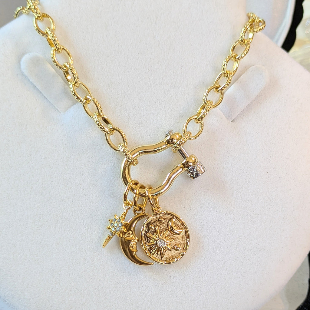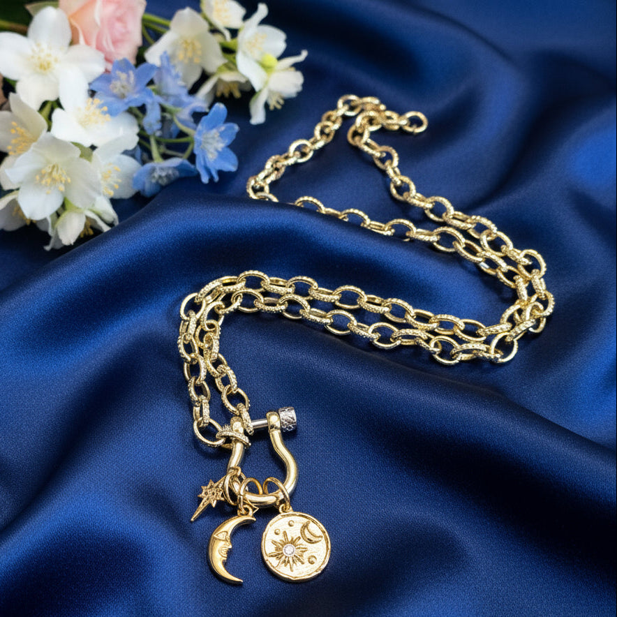 This striking necklace showcases a gold-filled CZ Sun and Moon pendant, complemented by a delicate crescent moon and sparkly north star charm. It hangs from a shiny gold horseshoe carabiner clasp and is paired with a luminous 24k gold-filled textured chain, making it an eye-catching accessory that will capture attention wherever you wear it. Lobster Clasp in back of necklace secures this design.
