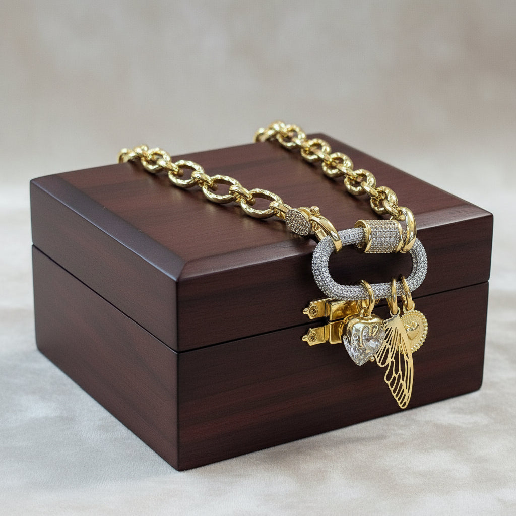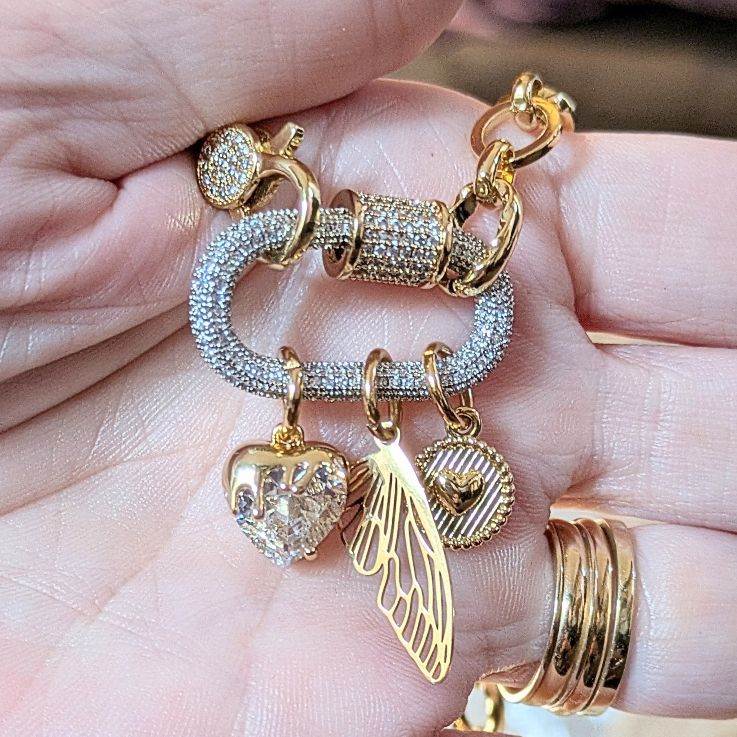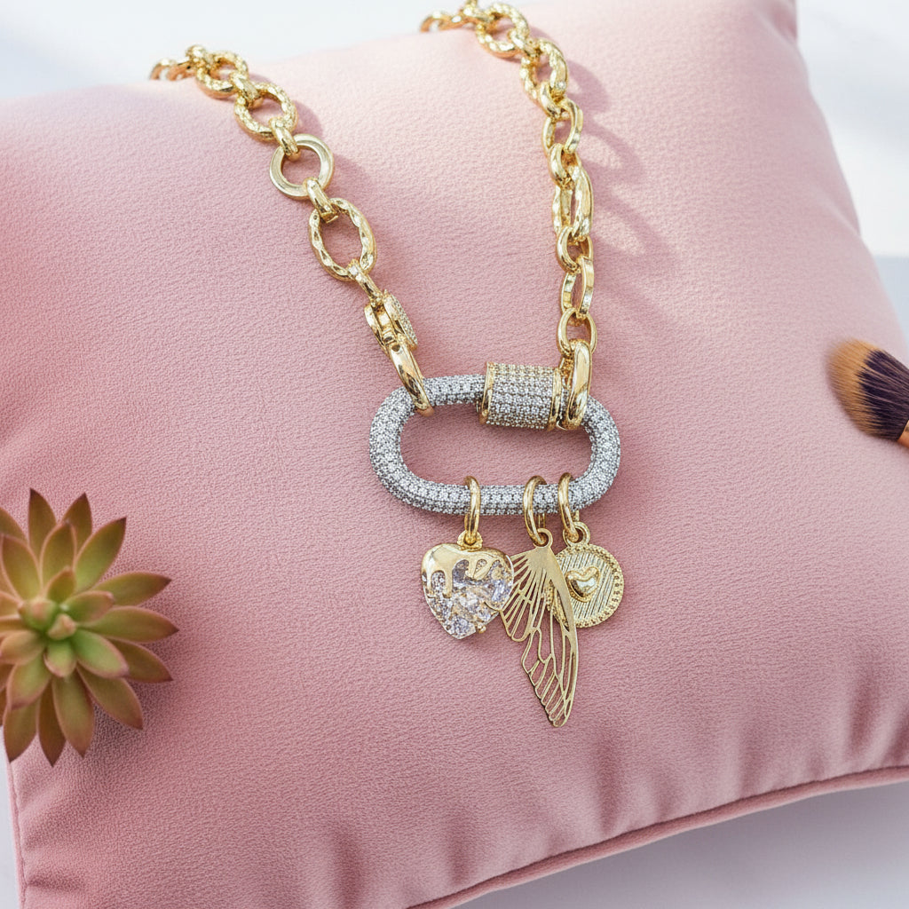 Dragonfly/Fairy Wing, Heart Carabiner Necklace, Gold - 20 inch