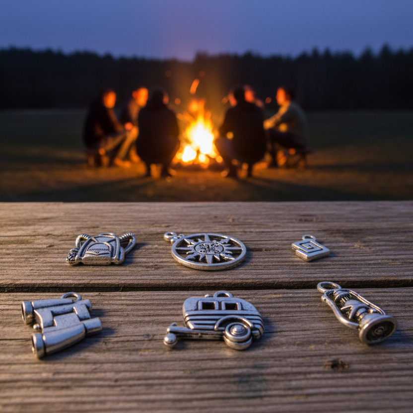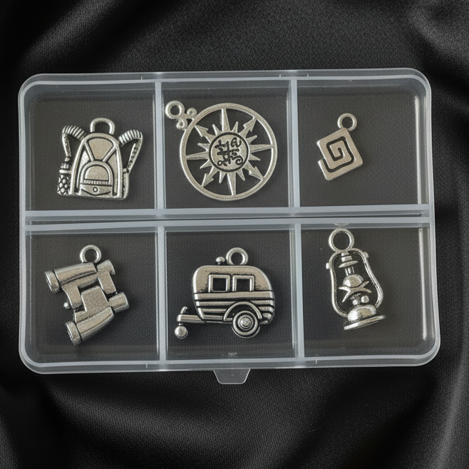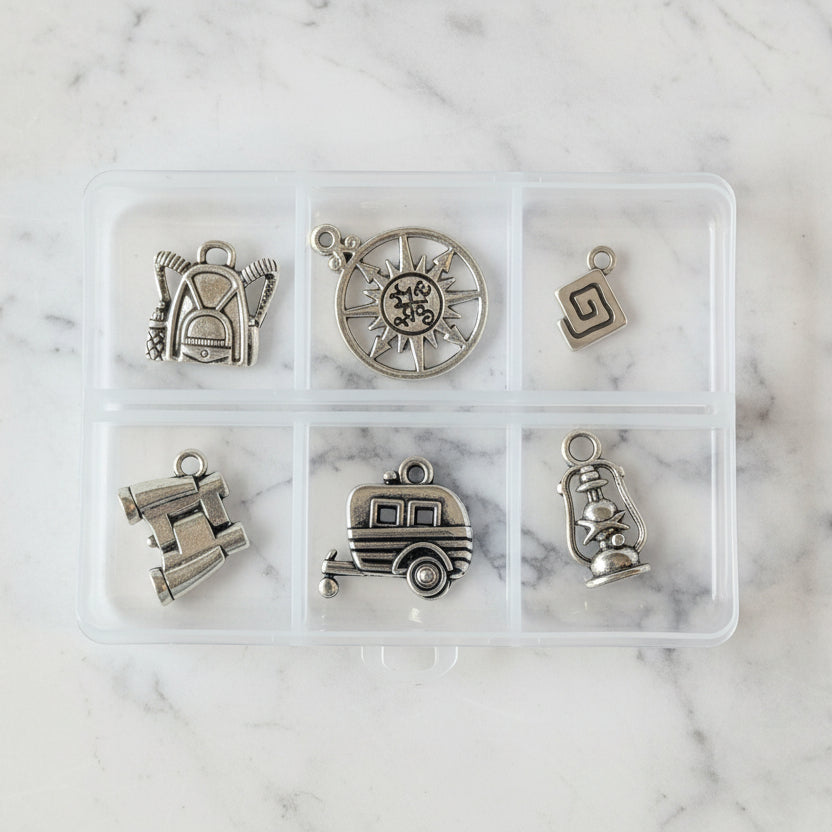 Six silver camping charms designed to build your perfect outdoor-themed bracelet or necklace. Mix with any charm base to create a personalized piece that celebrates your love of camping. Mix and match these versatile pieces with any of our charm bracelet bases to create a signature accessory uniquely yours. Whether you're treating yourself or surprising a fellow camping enthusiast, this collection transforms simple components into meaningful, wearable art that celebrates your camping vibe.