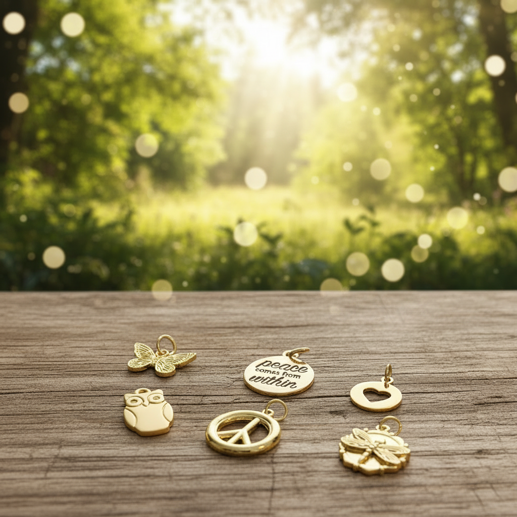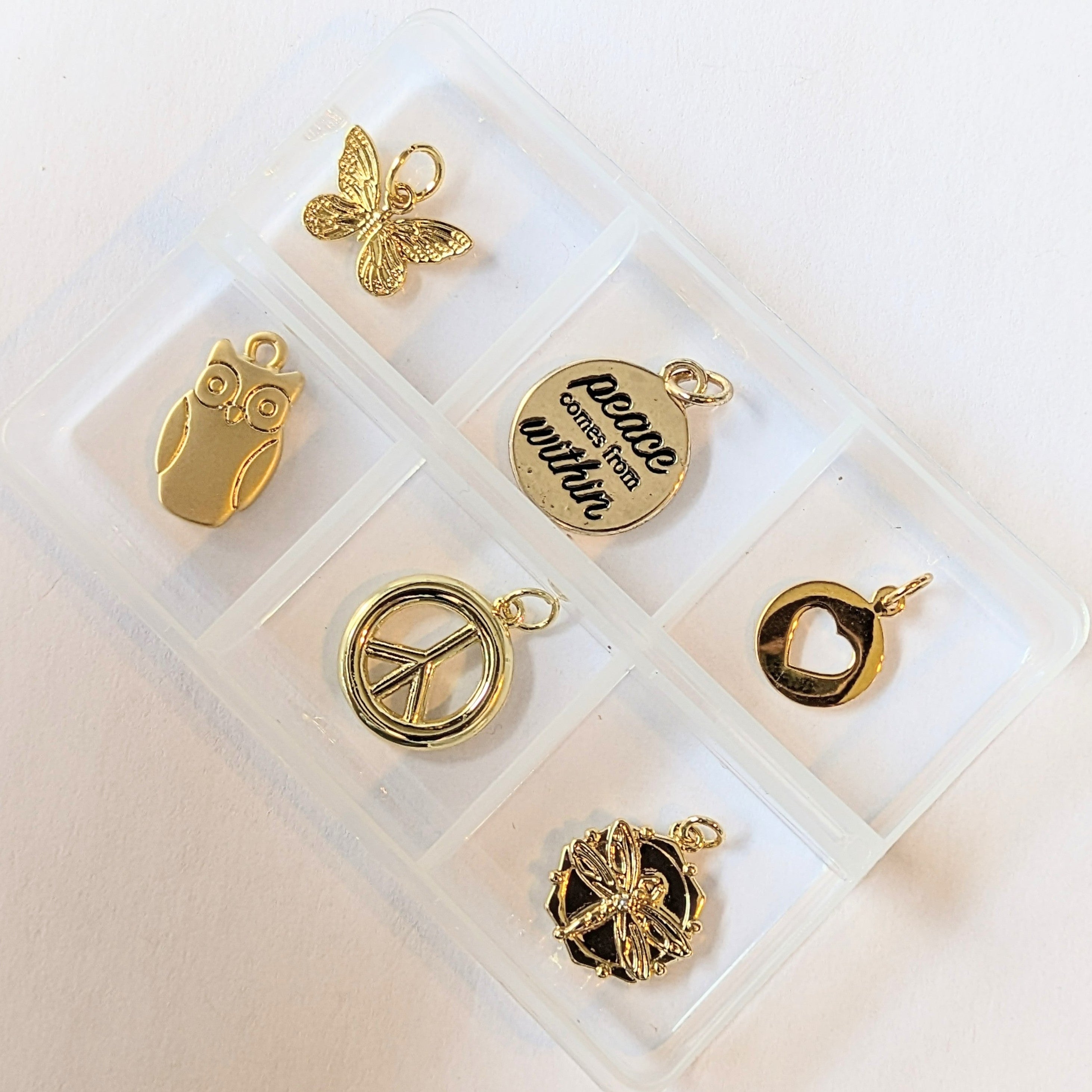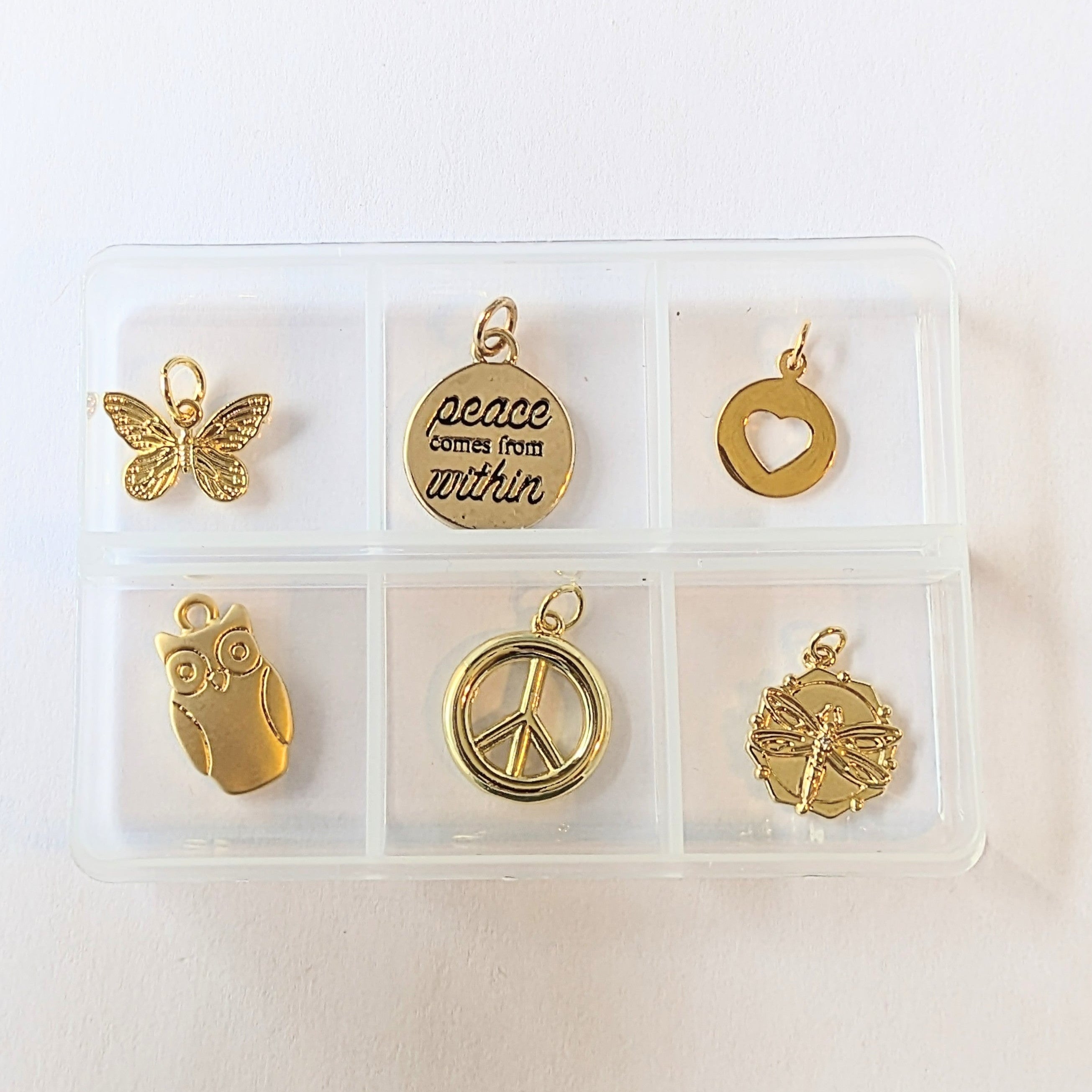 Elevate your jewelry collection with this stunning gold Mini Charm Box featuring six thoughtfully designed pieces. Each charm carries profound meaning—from the empowering "Peace Comes from Within" inscription to delicate representations of nature, spirituality, and affection. Layer them onto your favorite bracelet or necklace to express what matters most to you. Build a collection that's authentically yours, where every charm reflects your personal journey and celebrates the values that define you.